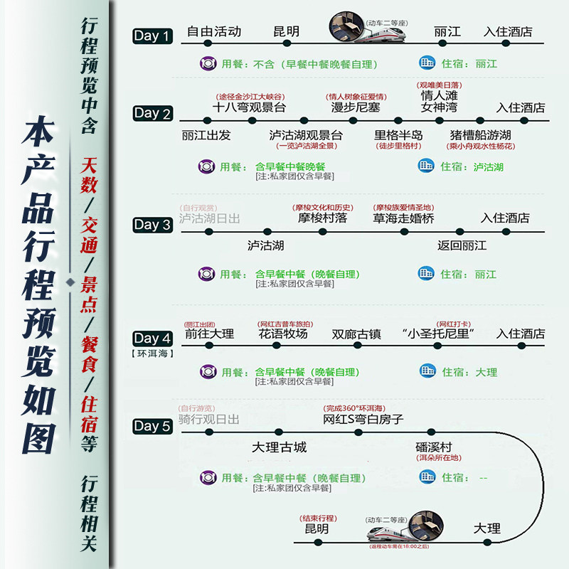 本线路以昆明为起点,巧妙结合高铁动车与精品小团模式,实现从省会城市向大理、丽江乃至泸沽湖的无缝衔接。对于商务出差后想顺道度假的旅客而言,无需操心交通换乘与路线规划,动车快速抵达核心城市后,专属小团即刻接续深度游程,兼顾效率与体验,让差旅后的放松之旅从容开启。