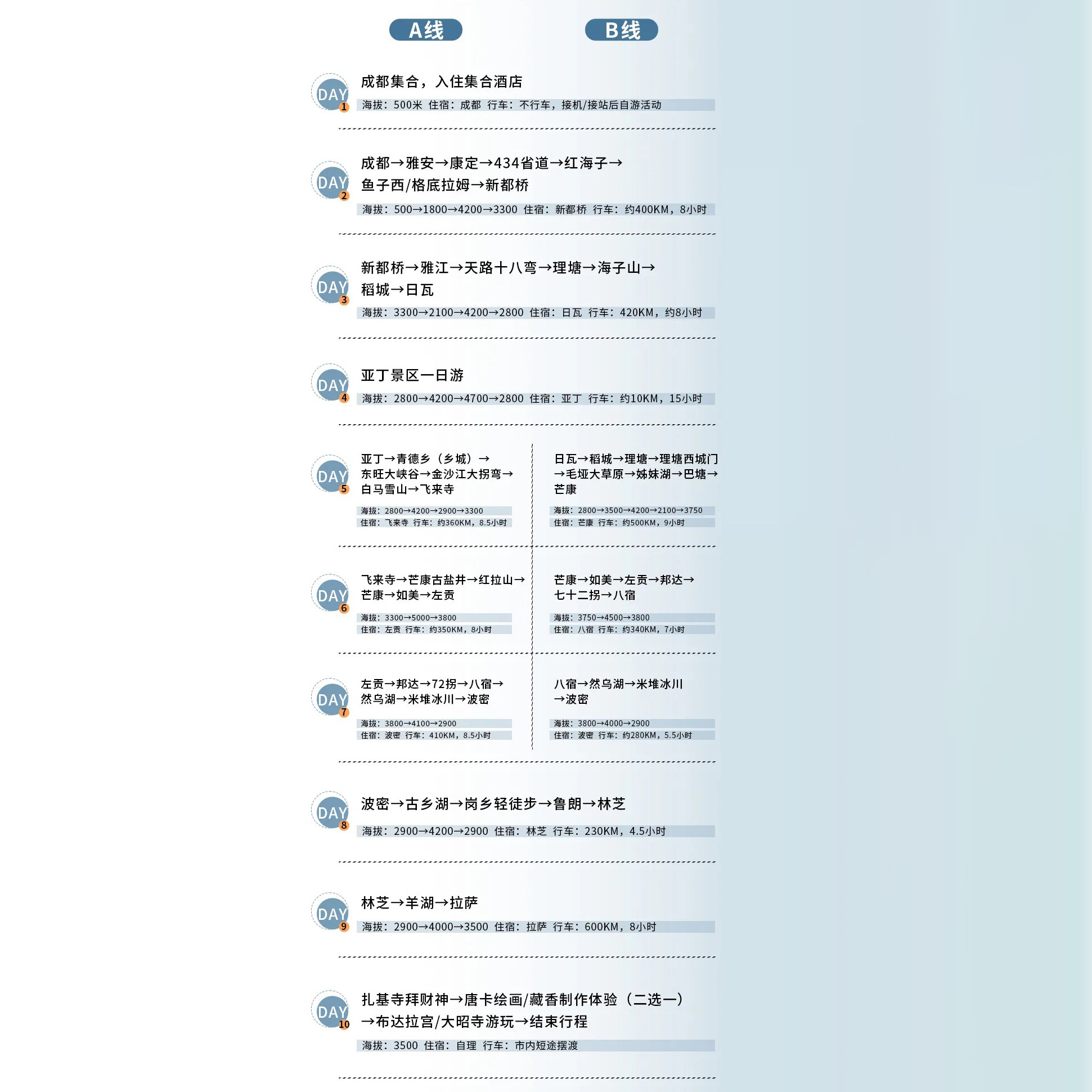 10日行程高效串联稻城亚丁、理塘、新都桥、芒康、林芝、拉萨等川藏滇核心目的地,涵盖雪山、冰川、圣湖、峡谷等多元地貌。对于希望在有限假期中最大化体验广度的差旅人士,此路线避免重复交通耗时,一次性打卡多个世界级景观,实现“一次出行,多重收获”,极具时间性价比。