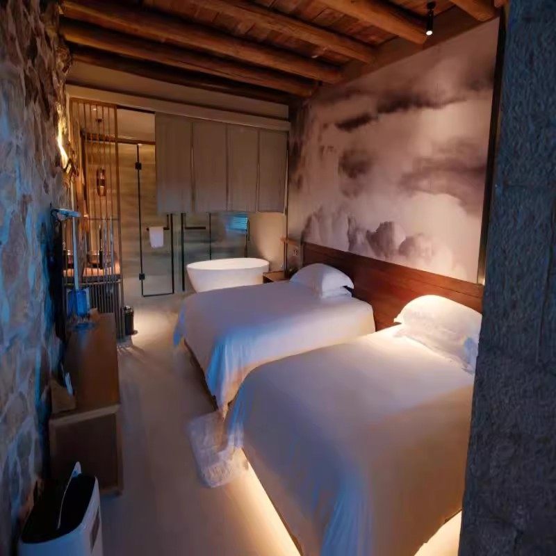客栈以东方禅意美学打造素心卧房,百年石屋建筑与现代舒适设施巧妙融合。房内配备除湿机、空调、液晶电视等齐全设备,兼顾文化沉浸感与实用功能性,让差旅人士在高效工作之余,也能感受‘天上人间诸景备,十二境中安舒怀’的居住哲学。