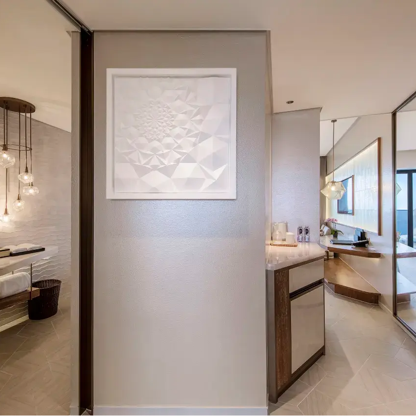 酒店以惠州千年‘盐’文化为设计灵魂,从吊灯、墙面到装饰细节,处处呈现盐晶美学,营造独特的精神休憩空间。对于注重体验感的差旅人士,这不仅是一次住宿,更是一场文化沉浸之旅。在高效完成工作之余,感受地域人文与现代设计的交融,为常规差旅注入艺术与哲思的深度。