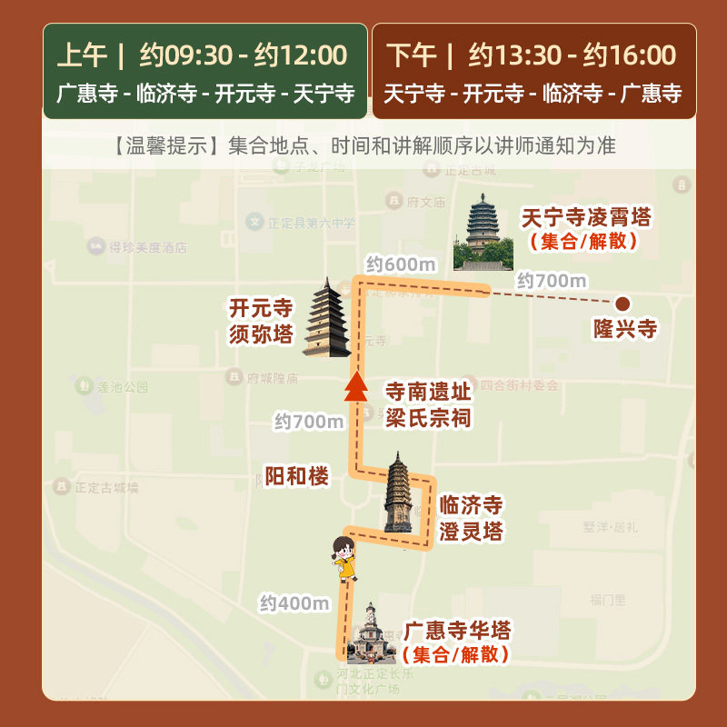 出差期间往往难以承受长途奔波与人挤人的景区压力。本线路精选正定古城核心文化地标,以步行方式串联四塔,路线成熟且人流可控,避免交通拥堵与排队困扰。全程约2.5小时,节奏舒缓却不拖沓,特别适合利用午休或会议间隙完成一次高质量的城市漫步,让差旅生活更富质感。