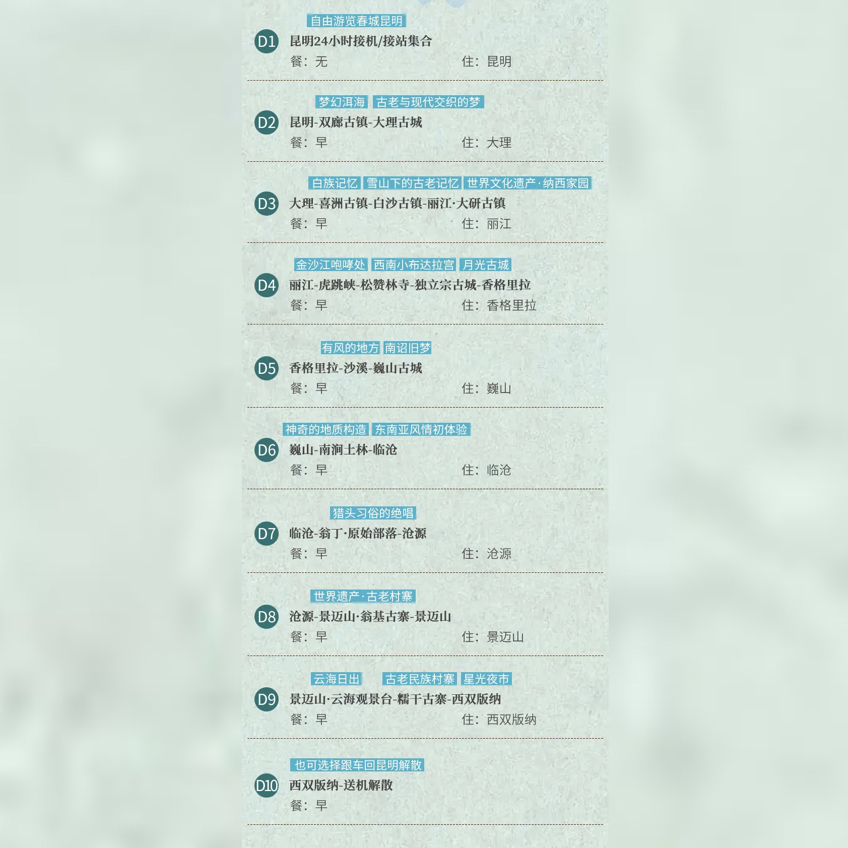 本行程以昆明为起点,高效串联大理、丽江、香格里拉、西双版纳、临沧、普洱等云南核心旅游城市,特别适合商务差旅后延伸度假的旅客。从高原湖泊到热带雨林,从古城巷陌到雪山秘境,10日深度环线设计避免重复路线,节省交通时间,最大化利用假期。全程安排接机服务与司机兼管家,让差旅人士在结束工作后无缝切换至休闲模式,轻松享受高品质云南之旅。