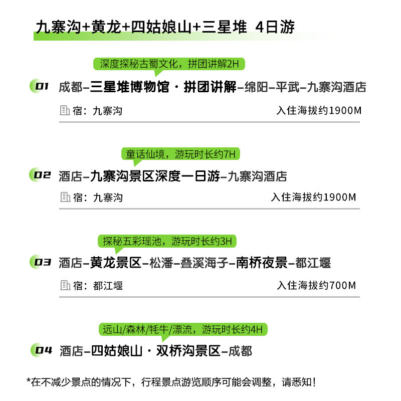 本行程从成都出发,覆盖九寨沟、黄龙、四姑娘山及三星堆等精华景点,全程交通、住宿、门票、导游服务一价全含,无需额外支出。特别适合商务人士或独自出行的差旅者,节省比价与协调时间,抵达即享高品质旅程。行程安排合理,兼顾自然风光与人文体验,让短暂假期也能深度放松身心。