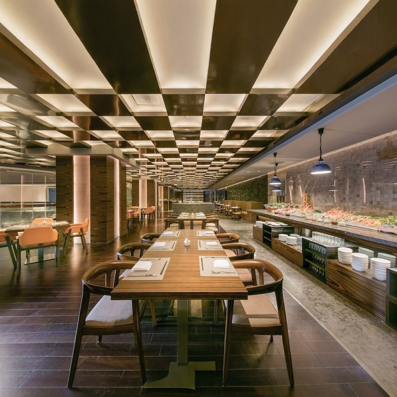 酒店顶层设有蓝色无边泳池,夜晚可一边畅游一边俯瞰璀璨的城市天际线。对于高强度工作的商务旅客而言,这里是放松身心、调整状态的绝佳空间。无论是独自冥想还是与同事小聚,都能在都市高空享受片刻宁静与浪漫。