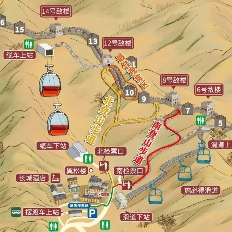 行程特别安排缆车(索道)上下山,不仅节省体力,更提供独特的‘空中观景’视角。上升过程中,长城如巨龙盘踞山脊,层峦叠嶂尽收眼底;下降时则可从容欣赏不同角度的壮美风光。这种‘滑索/索道+缆车观景’的组合,为差旅人士带来动静结合、高低交错的立体化游览体验,远超普通徒步所能及。