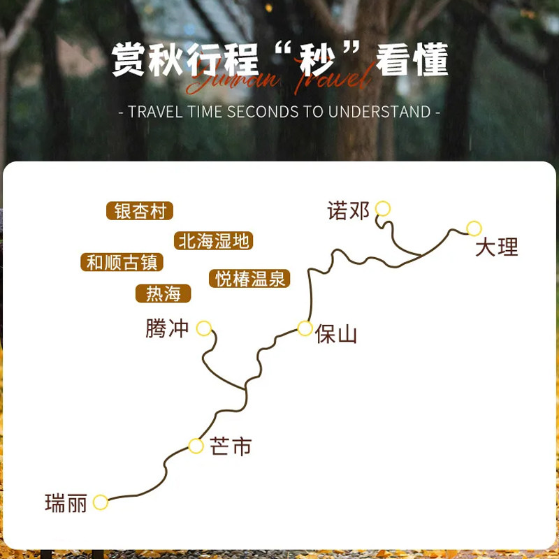 秋季是滇西最美的时节,银杏村金黄铺地,和顺古镇晒秋斑斓如画。本行程精准捕捉这一季节窗口,为差旅人士提供难得的视觉盛宴。即便因公出差,也能在周末或行程间隙邂逅一年仅此一季的秋日浪漫,丰富旅途记忆点。
