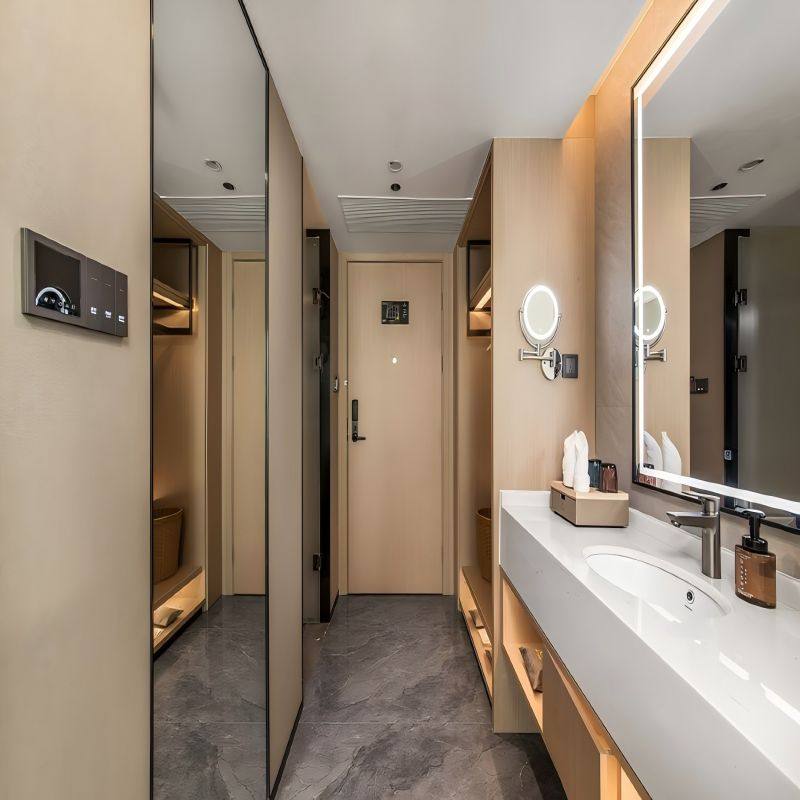 酒店客房全面配备智能化系统,支持语音指令调控灯光、空调、窗帘及电视等设备,无需起身即可营造理想休憩环境。高速Wi-Fi全覆盖、多功能办公桌及人体工学椅,为远程办公或视频会议提供专业支持,让1人可订的自由行兼具舒适与效率。
