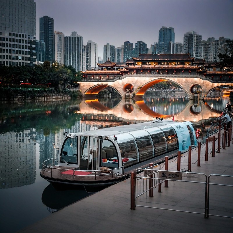 行程包含夜游锦江船票一张,让差旅人士在繁忙工作之余,沉浸于“老成都、蜀都味、国际范”的夜间美学场景。乘船沿东门码头至廊桥段,可欣赏菩提声光秀、十二月市光影长廊、合江亭帆船秀等动态文化展演,在杜甫诗句与现代光影交织中感受天府文化的浪漫底蕴,为商务之旅增添独特人文记忆。