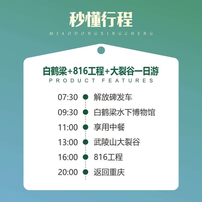 专为差旅人士设计的重庆一日游线路,将白鹤梁水下博物馆、816地下核工程与武陵山大裂谷三大高价值景点高效串联,全程交通接驳顺畅,行程紧凑不拖沓。无论您是出差间隙想快速体验山城文化,还是会议结束后寻求短暂放松,此线路都能在一天内满足您对历史、人文与自然奇观的多重期待,真正实现‘工作度假两不误’。