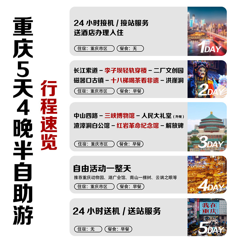 本行程支持1人独立预订,无需拼团等待,特别适合临时出差后顺道度假的商务人士。无论是独自出差结束后的放松之旅,还是短暂停留中的城市探索,都能轻松安排。重庆作为热门差旅目的地,交通便利、配套完善,结合半自助形式,让您在高效完成工作之余,也能深度体验山城魅力,实现工作与休闲的完美平衡。