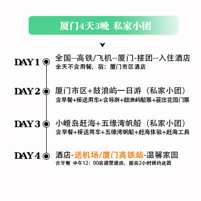 本行程专为差旅人士设计,支持2至6人灵活成团,既适合小型商务团队出行后的放松,也便于家庭或好友结伴度假。全程私家小团模式,避免大团拥挤,行程节奏可依需求微调,尤其适合在厦门出差后顺道深度体验当地文化与自然风光,实现高效差旅与惬意度假的无缝衔接。
