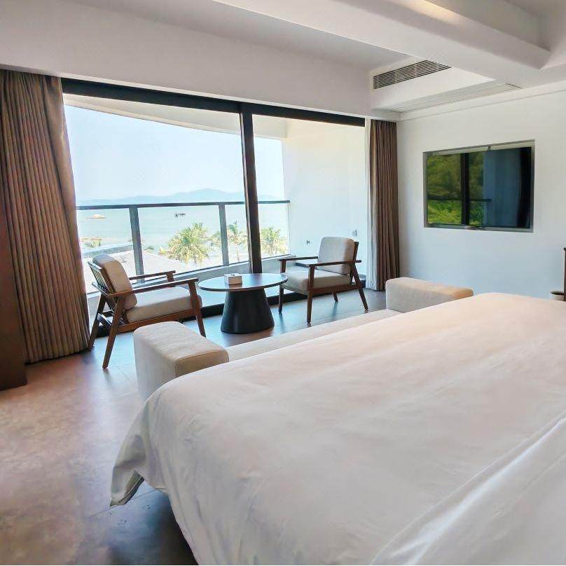 高级海景双床房专为差旅场景设计,既适合单人出差独享宁静海景,也便于同事同行分床入住,保障私密性与舒适度。房间依山面海,视野开阔,落地窗直面南海美景,让高强度工作后的身心得以舒缓。设施齐全、干净整洁,满足商务人士对住宿品质的基本要求,同时增添度假氛围。