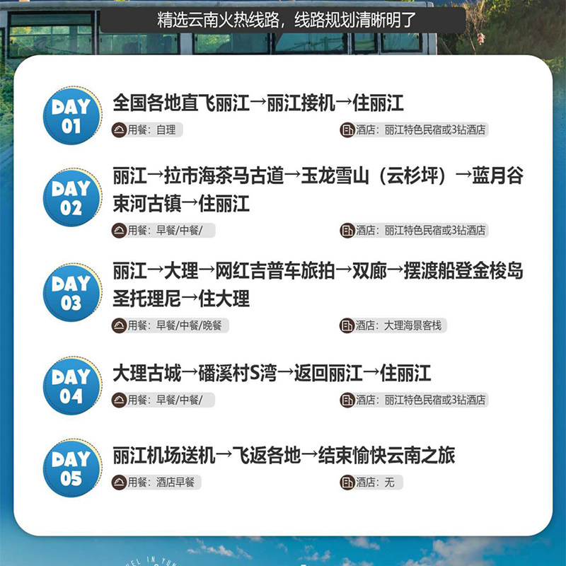精心设计的5天4晚行程,时间安排紧凑而不仓促,非常适合利用周五下午出发、结合周末与少量年假完成一次完整度假。覆盖玉龙雪山、洱海等核心景点,确保差旅人士在有限时间内高效打卡云南精华,兼顾效率与体验感。