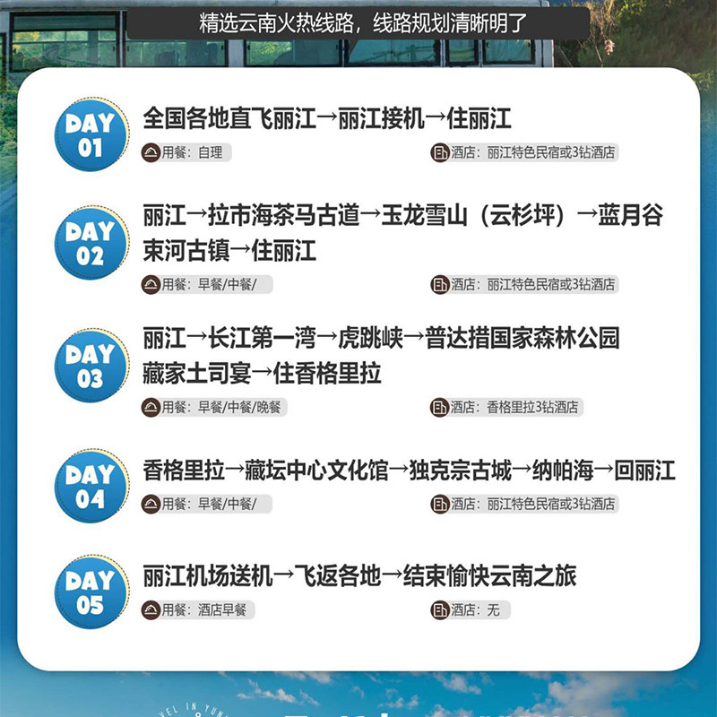 本线路支持从昆明或丽江出发,特别适合在云南有差旅安排的商务人士。无论您是在昆明参加完会议,还是在丽江处理完公务,均可无缝衔接本次5天4晚的度假行程,无需额外中转奔波,节省宝贵时间,让差旅与休闲高效融合。