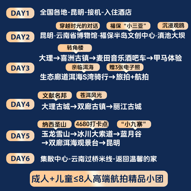 专为差旅人群设计的8人精品小团,既避免了大型团队的嘈杂与低效,又保留适度社交氛围,适合独自出差后希望结伴同行却不失独立性的商务人士。全程配备专属导游与用车,行程节奏张弛有度,白天深度游览昆明、大理、丽江及玉龙雪山,夜晚入住舒适海景房,确保差旅后的身心彻底放松,恢复活力。