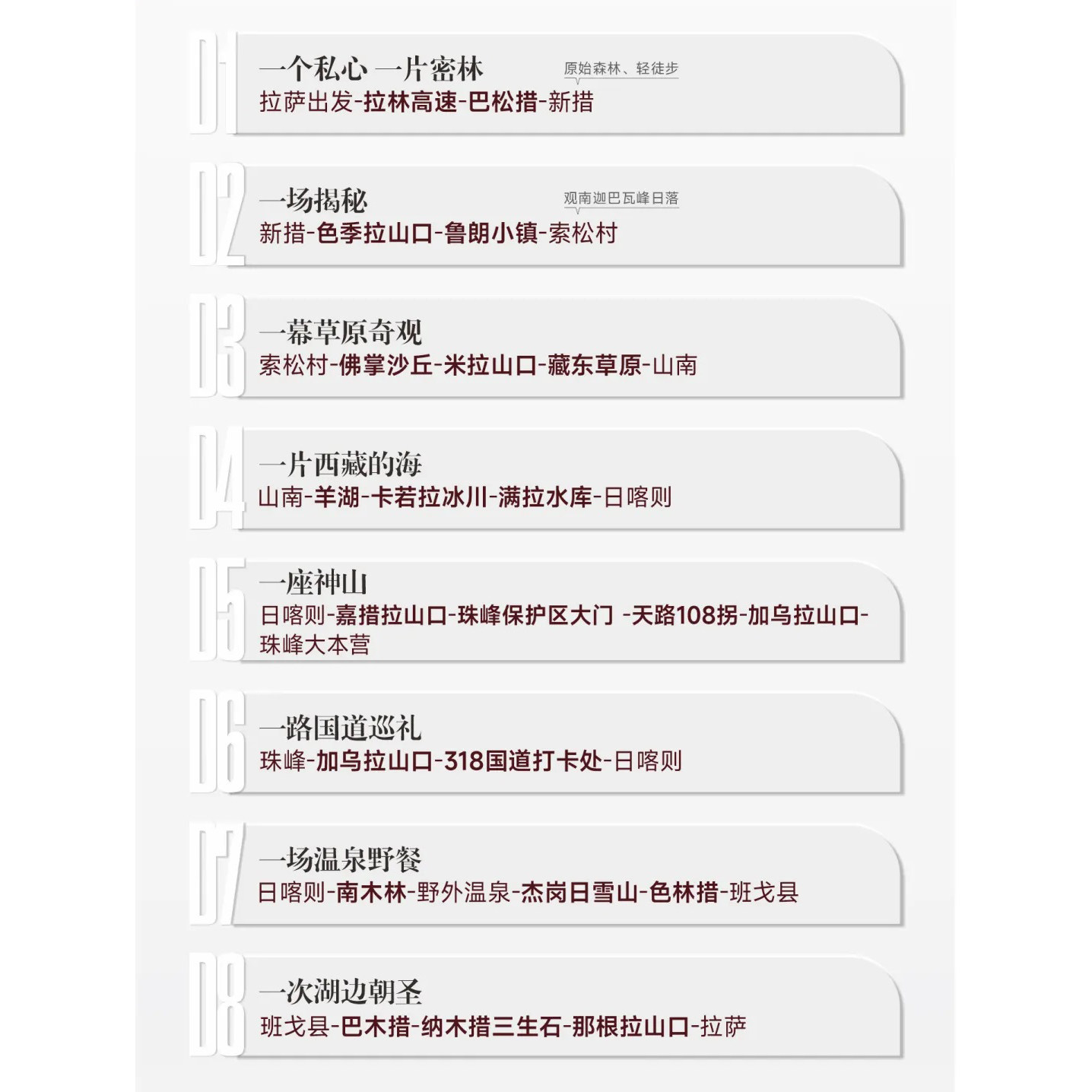 本行程以拉萨为起点,精心串联山南、日喀则、林芝、那曲等西藏核心目的地,打造8日高效全景大环线。路线设计拒绝走回头路,科学安排海拔梯度——从林芝低海拔逐步攀升至珠峰大本营,有效降低高反风险。商务或自由行旅客可在紧凑日程中一次性打卡羊卓雍措、巴松措、色林措、圣象天门等世界级景观,兼顾效率与深度体验,特别适合时间有限但追求高价值差旅度假人群。