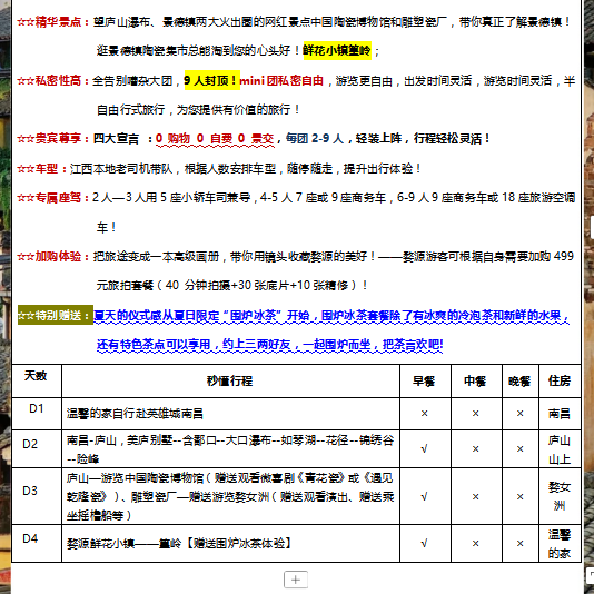 精心设计的4天3晚行程,完美契合现代职场人的休假节奏——只需请2天年假,即可畅享一个完整的长周末假期。从上海、杭州等地出发,周五晚或周六早出发,周日下午返程,高效利用碎片化时间。行程涵盖庐山自然奇观、景德镇陶瓷文化、婺源古村晒秋等多元体验,让短暂差旅间隙也能收获丰富人文与自然滋养,提升工作生活平衡感。