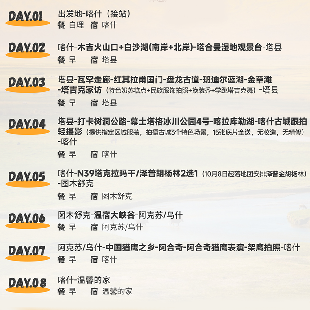 本线路专为从喀什出发的差旅人士设计,巧妙将商务出行与深度度假结合。行程涵盖喀什古城、帕米尔高原、胡杨林等标志性景点,8天7晚紧凑安排,既满足工作后的身心放松,又无需额外耗费时间中转。全程含机票及当地交通,节省差旅人员宝贵时间,实现‘落地即游’的无缝体验,让短暂假期也能沉浸于西域风情之中。