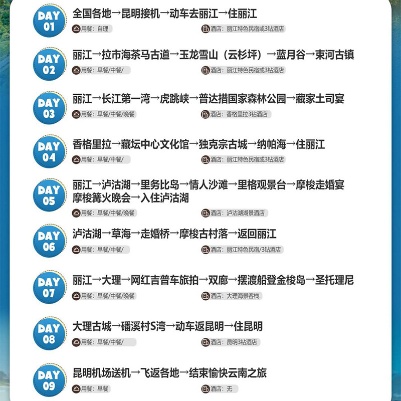 线路覆盖云南五大核心目的地,从省会昆明出发,经丽江古城、香格里拉高原、泸沽湖秘境至大理洱海,交通接驳顺畅,行程节奏张弛有度。特别适合利用差旅间隙进行多点联动游览,最大化利用9天8晚时间,一次出行饱览滇西北精华风光与人文景观。