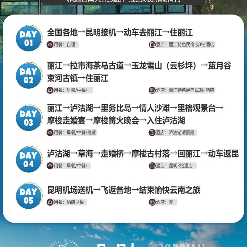 本线路支持从昆明或丽江两地灵活出发,特别适合差旅人士在完成公务后无缝衔接假期。无论您是在昆明参加完会议,还是在丽江处理完合作事宜,均可就近加入行程,省去额外交通周转时间。5天4晚的紧凑安排兼顾效率与深度体验,让您在有限时间内畅游玉龙雪山、泸沽湖等核心景点,实现工作与休闲的完美平衡。