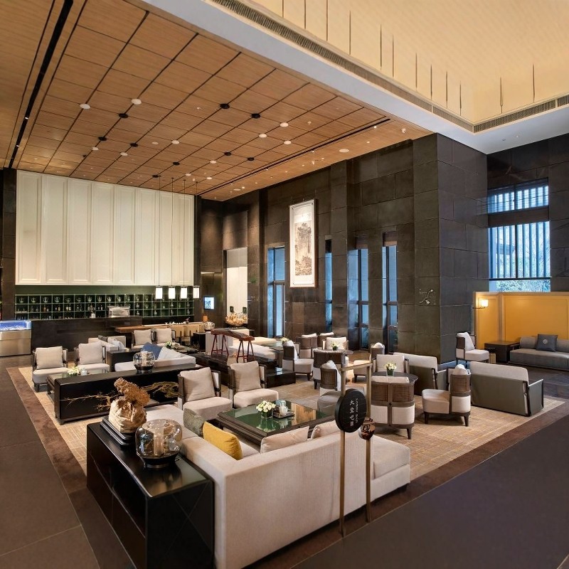 酒店独创“泛舟入店”仪式,客人乘竹筏沿2万㎡景观水系抵达大堂,瞬间脱离都市喧嚣。客房以“琴棋书画诗酒花茶香”九雅为主题,差旅人士可在露台临帖、点茶,15分钟微体验即可沉浸国学意境。十大文化场景如泊松亭、翠竹林均免费开放,无需额外行程安排,高效完成文化充电。