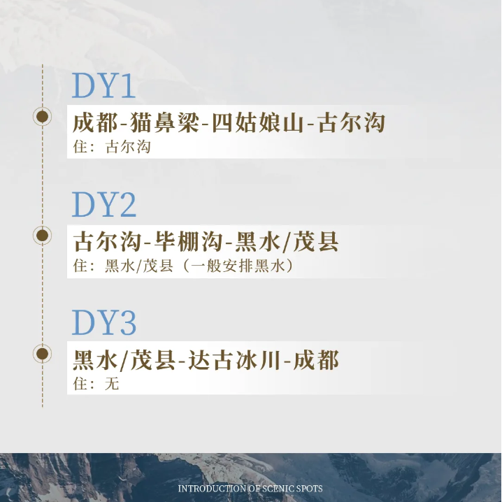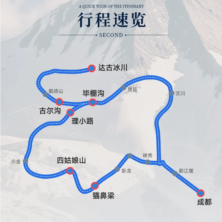 线路设计充分考虑差旅时间成本,从成都市区出发,3日即可完成深度游览并返回。首日直抵毕棚沟,次日探访四姑娘山,第三天登临达古冰川,全程交通衔接顺畅,无冗余等待。特别适合周五下班后出发、周日晚返程的周末差旅延伸需求,最大化利用碎片化假期。