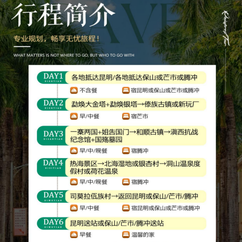 6天行程覆盖芒市、瑞丽、腾冲三大目的地,集边境异域风情、火山地热奇观、千年古镇、金色银杏林于一体。差旅人士假期宝贵,此线路高效整合自然、人文、康养、摄影等多重元素,一次出行收获多元体验,避免重复奔波,实现假期价值最大化。