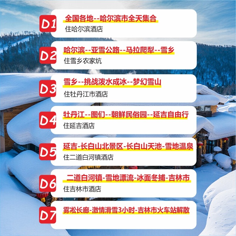 精心设计的7天6晚行程,每日主题明确、车程合理,避免无效耗时。从哈尔滨中央大街到雪乡童话世界,再到长白山天池温泉,经典景点全覆盖。差旅人士可利用周末+年假组合,高效完成一次跨省深度游,无需额外请假,真正实现“一次出行,多重收获”。