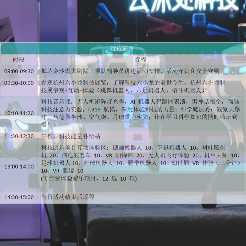 专为差旅人士设计的【科技派·梦想秀】杭州六小龙科技乐园研学一日游,巧妙结合商务出行与亲子/青少年教育需求。行程紧凑、内容丰富,适合在杭州出差期间抽出一天时间,带孩子或学生体验前沿科技互动项目。无需长途奔波,本地出发即享沉浸式VR体验、科学探索课程及特色灯光秀,让差旅不再单调,兼顾效率与陪伴。