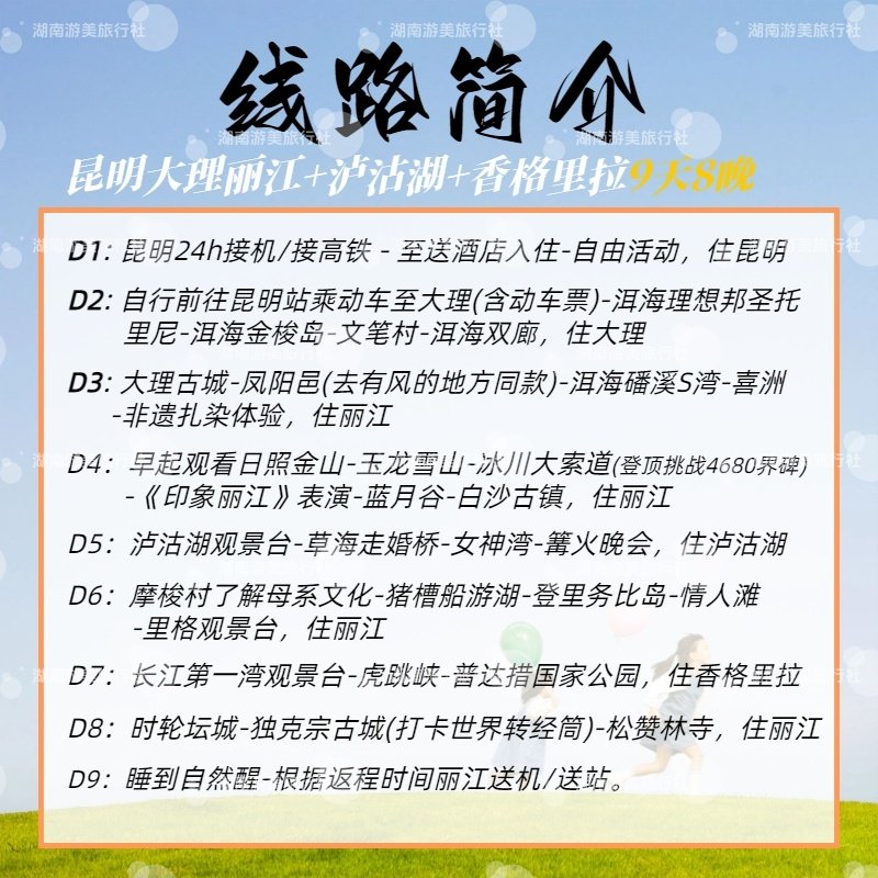 从昆明出发,一路经大理、丽江,深入泸沽湖(丽宁十八弯)、香格里拉(迪庆),9天内高效串联云南最具代表性的自然与人文景观。对于时间有限的差旅人群,此线路避免重复交通,最大化利用假期,一次出行即可领略高原湖泊、古城文化、雪山草甸等多元风貌。
