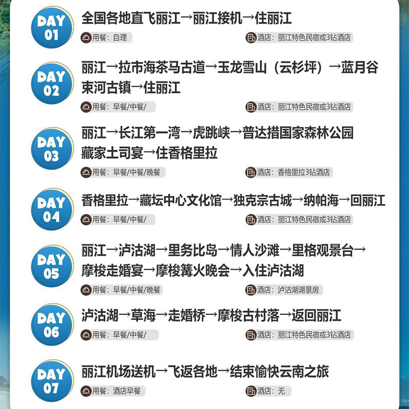 本线路支持1人独立报名参团,无需拼凑人数,特别适合商务差旅人士在完成工作后无缝衔接度假行程。从昆明或丽江出发,灵活选择起点,节省中转时间,让差旅与休闲完美融合。7天6晚的行程节奏张弛有度,既满足高效出行需求,又确保深度体验云南多元文化与自然风光,是差旅人士兼顾效率与放松的理想之选。