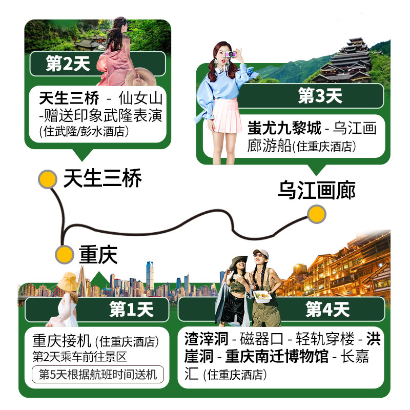 本行程支持1人独立预订,无需拼团等待,特别适合临时出差后顺道度假或独自出行的商务人士。无论是会议结束后的放松,还是独自探索山城魅力,您都能即刻启程,省去协调多人时间的繁琐,真正实现差旅与休闲的无缝衔接。全程5天4晚节奏舒缓,兼顾效率与体验,是现代职场人理想的城市微度假选择。