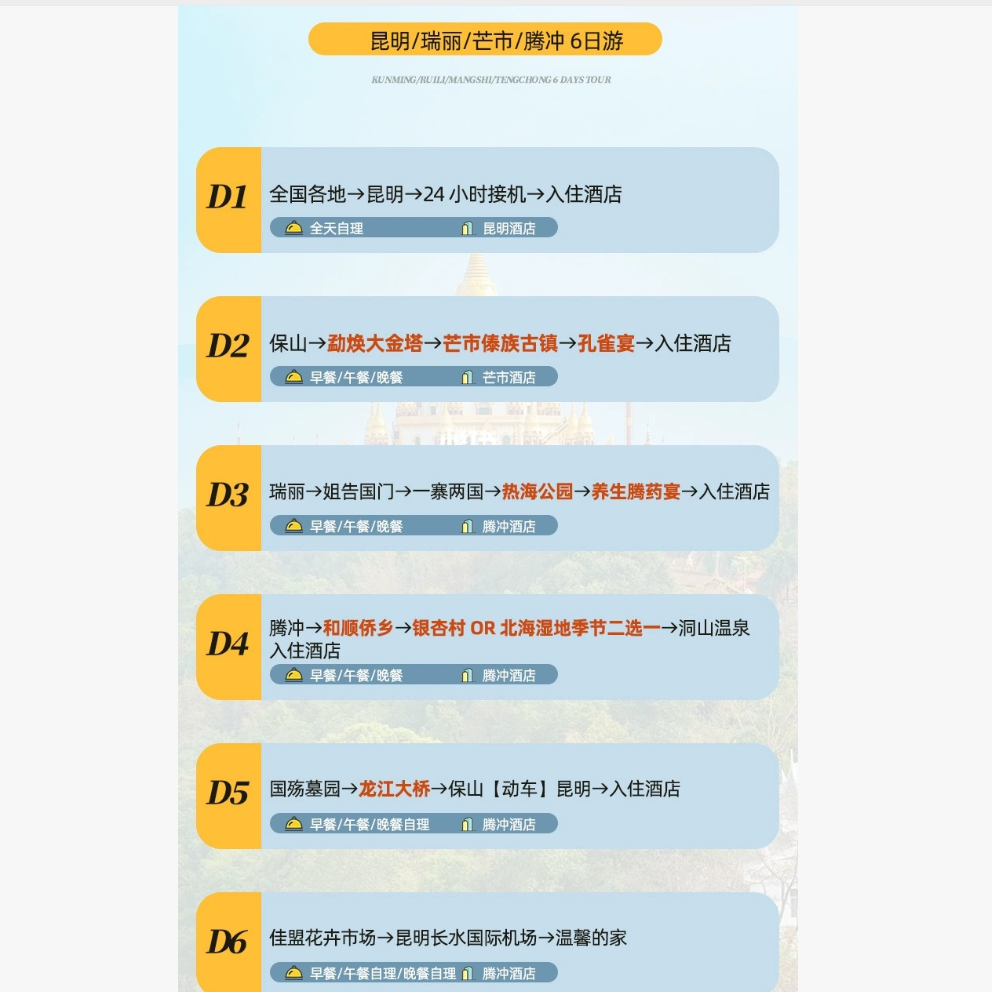 专为时间宝贵的商务人士量身打造,6天5晚行程节奏张弛有度——既涵盖腾冲热海、芒市大金塔、瑞丽姐告口岸等核心景点,又预留充足自由活动时间用于休息或处理紧急工作。全程无购物陷阱,所有项目一价全包,最大化利用有限假期,实现‘短时高效、深度放松’的差旅度假目标。