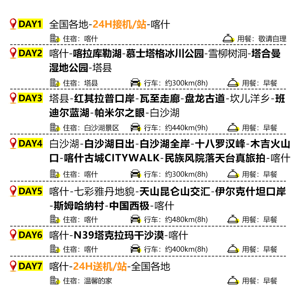 以“西极人文与自然奇观”为主题,串联喀什古城、帕米尔高原、白沙湖、慕士塔格峰等核心IP,打造一条兼具历史厚度与地理广度的精品线路。对于追求高效高质体验的差旅人群,这种主题化设计避免走马观花,确保在7天内获得多层次感官与认知冲击,让短暂假期也能收获丰富精神滋养,远超普通观光游的价值感。