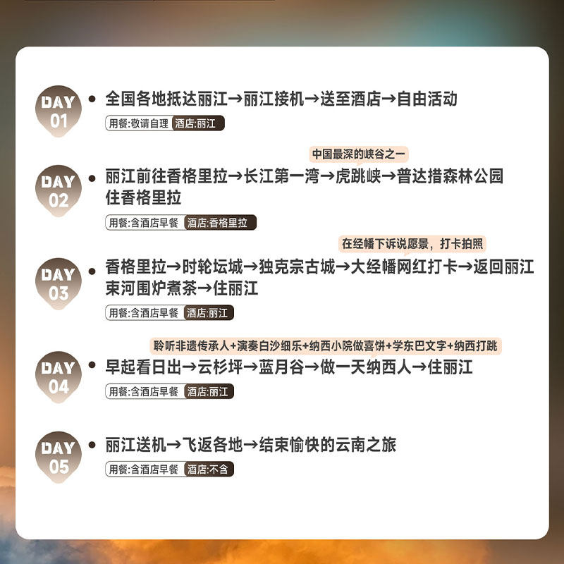 本行程支持1人独立预订,无需拼团等待,特别适合商务差旅人士或独自出行的旅客。无论您是临时出差后顺道度假,还是希望在工作间隙放松身心,都能快速锁定席位,灵活安排5天4晚的云南之旅。小团模式确保服务品质,兼顾效率与体验,让您的差旅行程无缝衔接休闲时光。