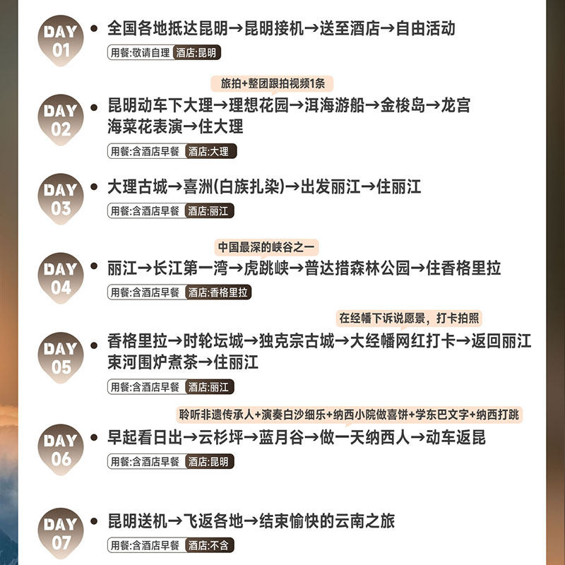 本线路支持1人单独预订,无需拼团等待,极大提升了商务差旅或独自度假的灵活性。无论是临时出差后顺道放松,还是独自开启一段人文之旅,都能即刻出发。行程涵盖昆明、大理、丽江、香格里拉四大目的地,7天6晚深度体验云南多元文化,兼顾效率与休闲,是差旅人士理想的选择。