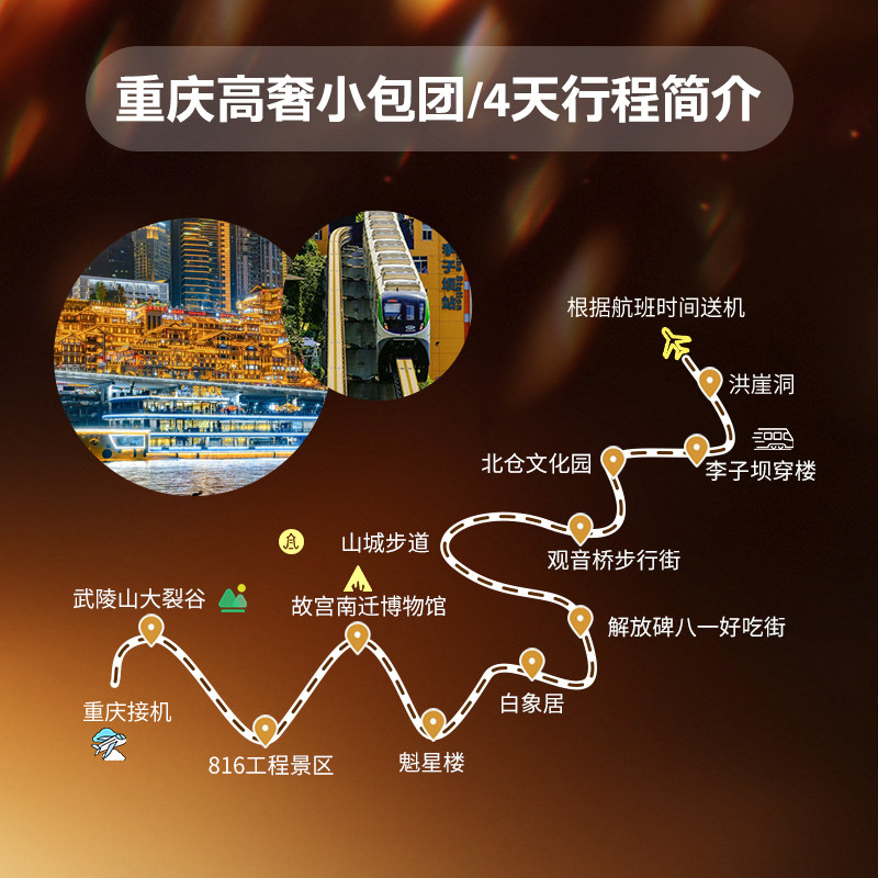 巧妙融合红色工业遗产(816地下核工程)与网红地标(洪崖洞),满足差旅人士多元兴趣。无论是客户接待还是自我探索,都能在短时间内领略重庆的历史厚度与潮流活力,提升行程的文化附加值与社交谈资。