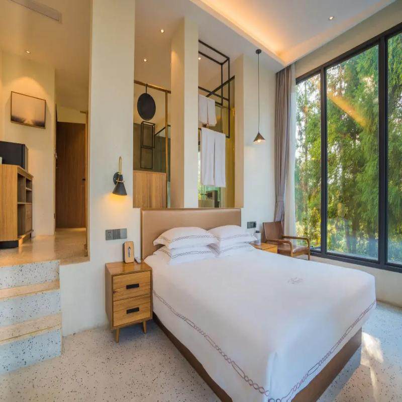 不同于传统商务酒店的刻板风格,岭里沐里以文艺清新风打造空间氛围,融合茶、诗、酒等在地文化元素,营造出兼具美学与实用性的差旅居所。木质家具、落地窗山景、复古装饰细节,让每一次入住都成为视觉享受。在高效完成工作任务之余,亦能获得精神层面的愉悦与放松。
