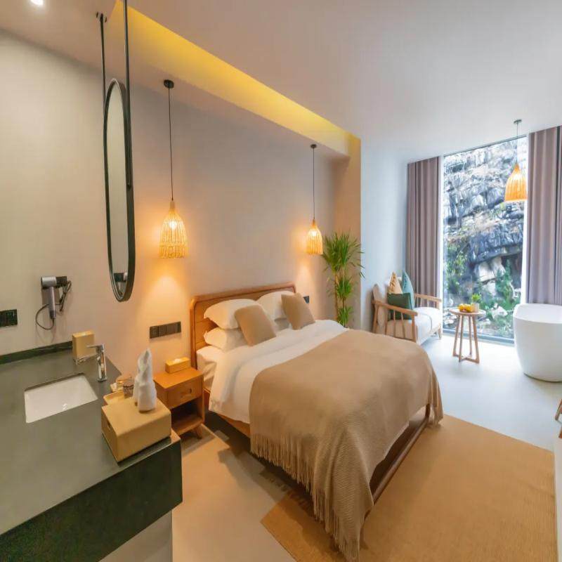 在快节奏的差旅途中,黄果树山生三舍民宿的清露·山景大床房为您提供一处静谧避风港。房间以侘寂美学为设计核心,采用微水泥墙面、原木家具与藤编器具,搭配窗外连绵山景,营造出返璞归真的宁静氛围。无论是商务出差后的疲惫,还是旅途中的浮躁,都能在此被山风与光影温柔抚平。推窗即见绿意,入夜可听虫鸣,让短暂的停留成为身心重启的契机。