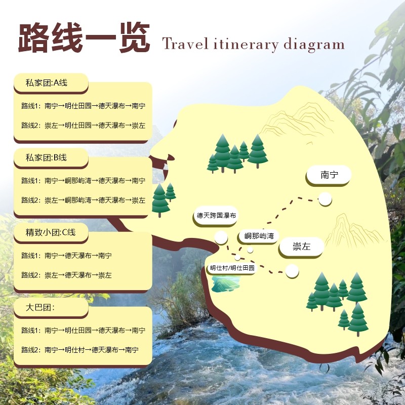专为差旅人士设计,从南宁便捷出发,当日往返崇左德天跨国大瀑布与明仕田园,行程紧凑却不失深度。全程舒适纯玩大巴接送,省去交通规划烦恼,让商务出行之余也能沉浸于喀斯特山水与壮乡风情之中,实现高效工作与身心放松的完美平衡。
