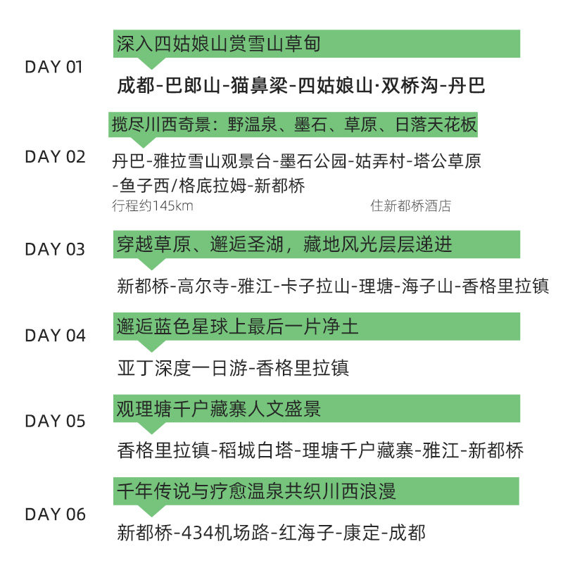 从成都(差旅枢纽城市)一站式出发,6天内高效覆盖稻城亚丁、四姑娘山、鱼子西、新都桥等川西经典目的地。路线经过精心优化,减少无效车程,最大化游览时间。特别适合利用周末+年假组合出行的商务人士,或在成都参加会议后直接转场度假,实现工作与旅行的无缝衔接。