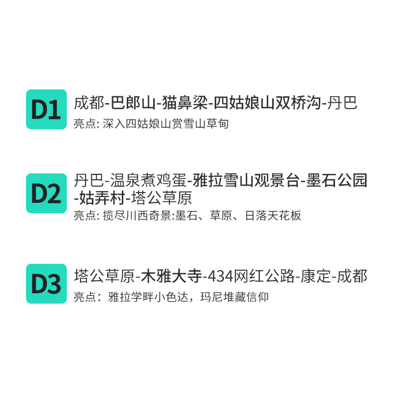 从成都便捷出发,3天内高效覆盖四姑娘山、新都桥、塔公三大川西精华目的地,路线设计紧凑却不仓促。特别适合周末或短假期出差顺游的商务人士,最大化利用碎片时间,避免长途跋涉的无效耗时,实现“出差+度假”无缝衔接。