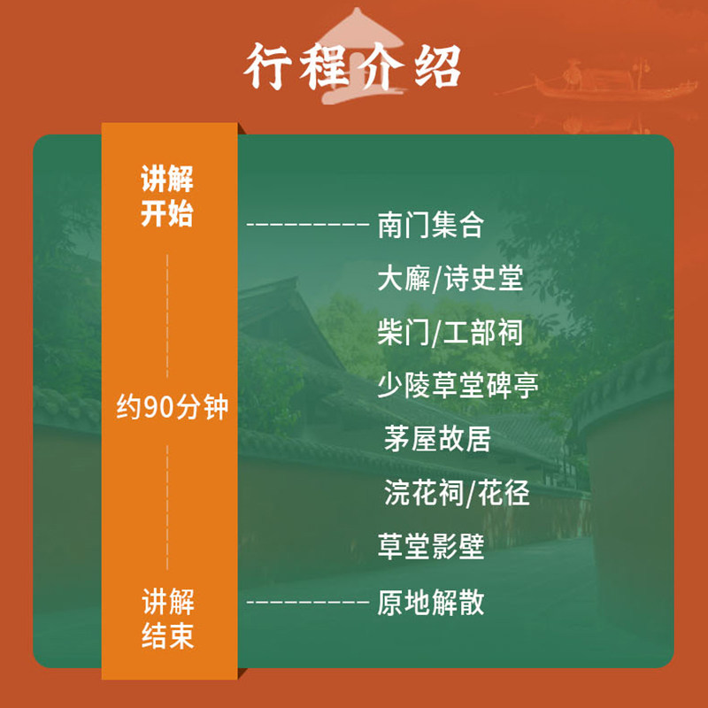 针对差旅人士时间紧张的特点,本产品精心设计1.5小时游览时长,精准覆盖杜甫草堂核心景点与文化亮点。无需全天占用,即可完成一次有深度的文化体验。无论是会议间隙、航班前后,还是周末延展停留,都能轻松嵌入您的差旅行程,提升出行价值感。