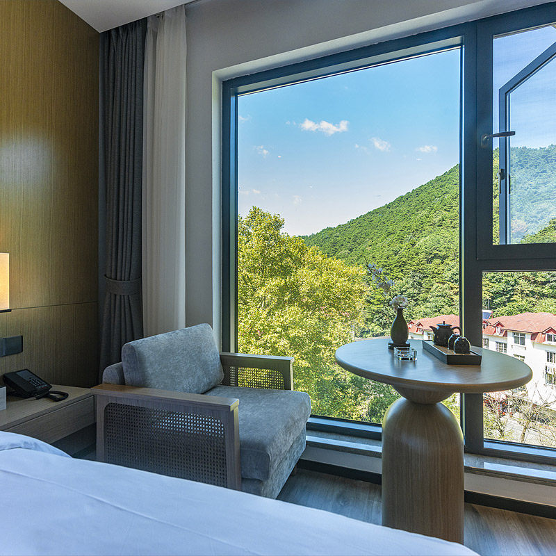酒店四周苍松翠柏、溪水潺潺、云雾缭绕,空气负氧离子含量极高,是名副其实的天然氧吧。对于长期处于高压工作环境的差旅人士,入住此处不仅能改善睡眠质量,还能在晨起散步或傍晚观景中快速恢复精力,实现“工作+休养”双重目标。