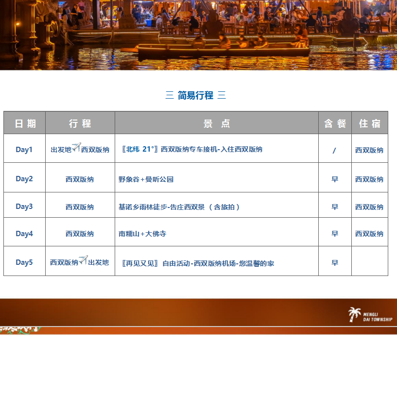 针对来自上海、北京、广州、深圳等一线城市的商务人士,本行程支持直飞西双版纳,大幅缩短中转时间,让差旅与度假无缝衔接。航班安排灵活,可配合工作日程,抵达后即享专属接机服务,快速入住5钻酒店,确保您在繁忙工作之余也能高效开启热带雨林疗愈之旅,真正实现‘说走就走’的差旅休闲一体化体验。