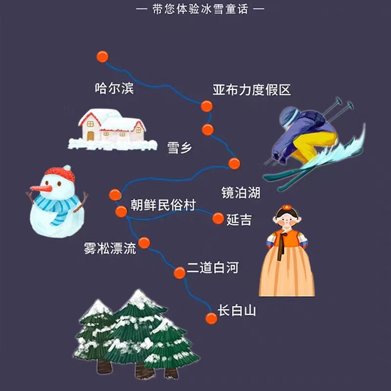 本行程专为从哈尔滨出发的差旅人士设计,无需额外安排大交通中转,节省宝贵时间与精力。哈尔滨作为黑龙江核心城市,交通便利、配套成熟,无论是商务出差后顺道度假,还是周末短途放松,都能无缝衔接。行程覆盖亚布力、雪乡、长白山、延吉等经典冰雪目的地,实现高效出行与深度体验的完美结合,让差旅与休闲真正融为一体。