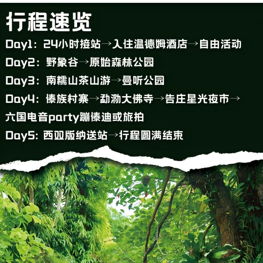 专为时间宝贵的差旅人群优化日程:第1天抵达即入住温德姆,避免舟车劳顿;第2-4天集中游览野象谷、原始森林及文化景点,节奏张弛有度;第5天轻松返程。无论您从合肥、南昌还是福州出发,均可在周末或短假期完成一次高质量度假,实现“三天工作+两天度假”的理想平衡。