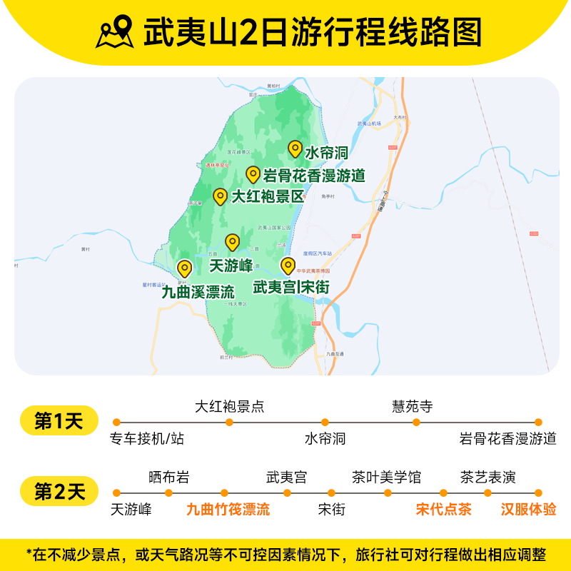 专为时间紧张的差旅人群定制,2天1晚的行程长度恰到好处——周五下班出发、周日晚返程,或利用两天会议之间的空档,均可轻松嵌入。住宿、交通、门票、体验全包,无需额外操心。在武夷山的山水茶香中快速充能,周一重返岗位时精神焕发,真正实现‘短假高效回血’的差旅度假新范式。
