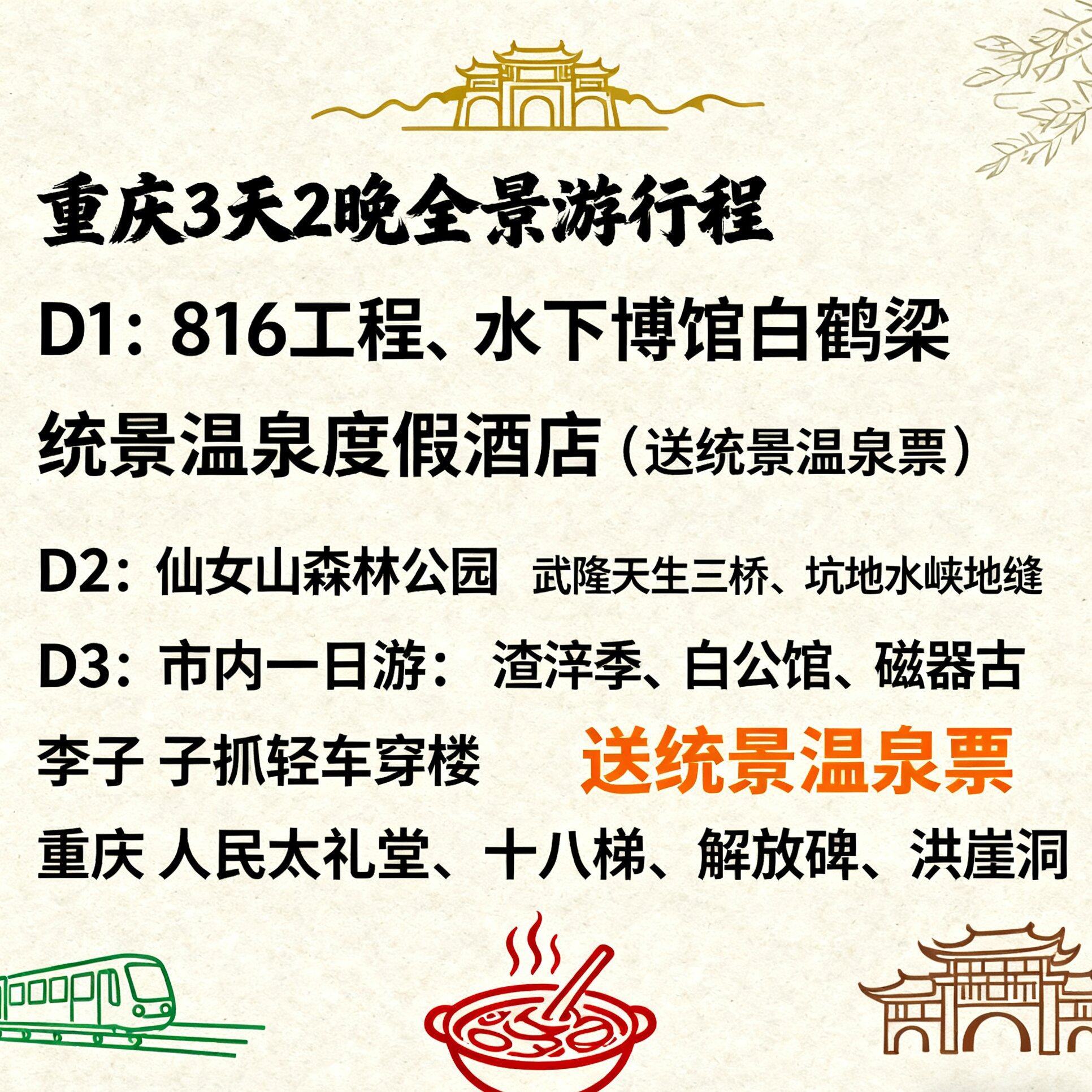 行程特别融入重庆独有的历史人文景点——神秘的816地下核工程与千年水下碑林白鹤梁。这些兼具科技感与文化底蕴的地标,不仅丰富了差旅期间的见闻,也为商务社交提供独特谈资。短短半天即可完成一次穿越时空的文化之旅,高效而不失深度。