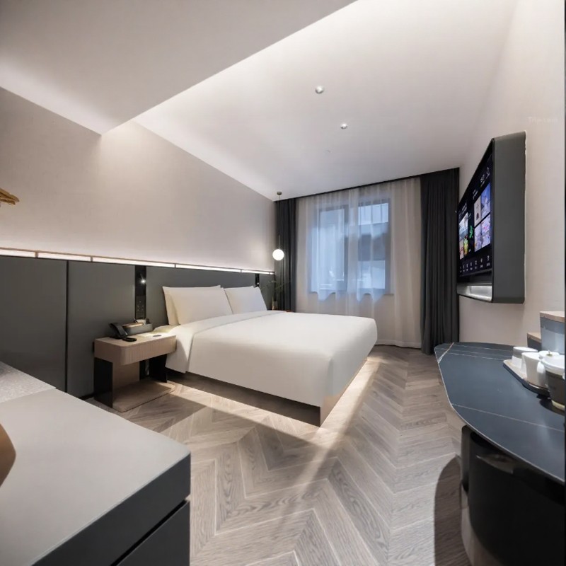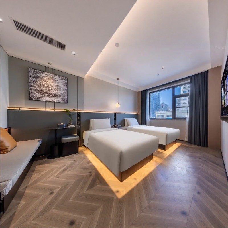 酒店整体采用文艺清新与MUJI风融合的设计语言,原木色调、简约家具与柔和灯光营造出宁静雅致的氛围。公共区域设有阅读角与艺术装置,让差旅人士在处理邮件之余,也能翻阅一本好书、欣赏一幅插画,获得精神上的短暂抽离。这种兼具美学与功能的空间,特别适合需要灵感迸发的创意型职场人。